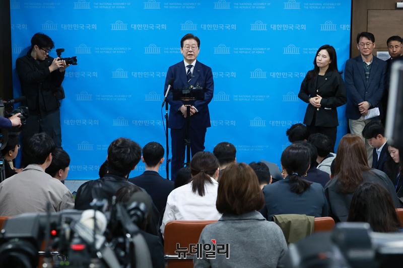 대선 출마를 선언한 이재명 전 더불어민주당 대표가 11일 오전 국회에서 열린 '비전 선포식 및 캠프 인선 발표' 기자회견을 마치고 취재진의 질문에 답하고 있다. 이날 이 대표는 선거대책 본부장에 5선 중진 윤호중 의원을 총괄본부장에는 강훈식 의원, 공보단장에 박수현 의원, 상황실장에 한병도 의원, 정책본부장에 윤후덕 의원, 정무 전략본부장에 김영진 의원, 비서실장에 이해식 의원, 대변인에 강유정 의원, 토론 본부장에 이소영 의원이 각각 인선됐다고 밝혔다.