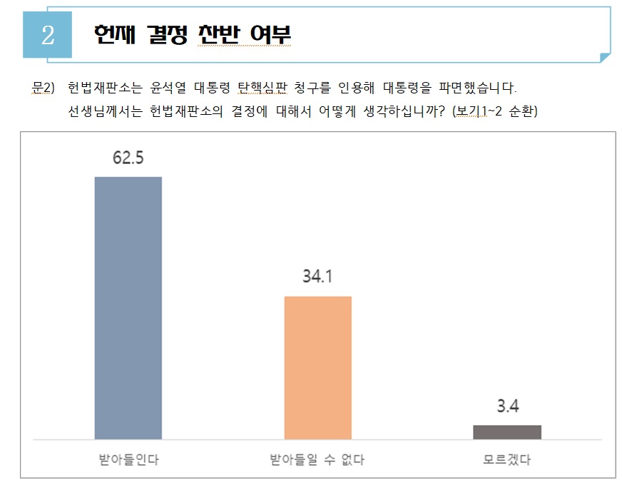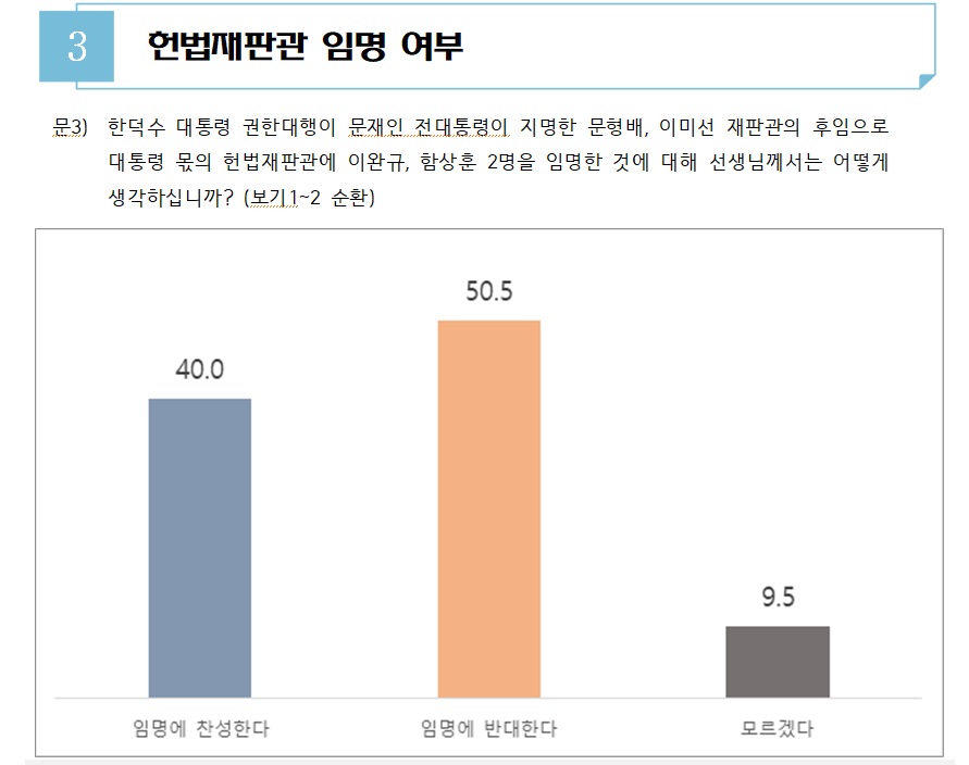 헌법재판관 임명 반대 50.5% vs 찬성 40.0%헌재 尹 파면 '찬성' 62.5% vs '반대' 34.1%
