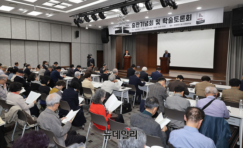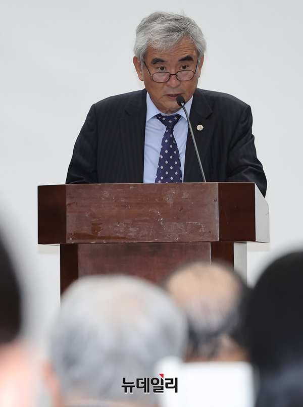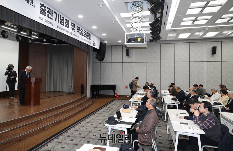 이영훈 이승만학당 교장이 11일 오후 서울 중구 은행회관 국제회의실에서 열린 '반일 종종의 역사 내란' 출판기념회 및 학술토론회에서 인사말을 하고 있다.