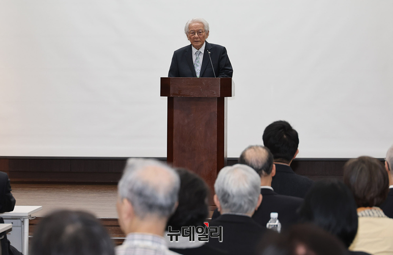 이영일 전 국회의원이 11일 오후 서울 중구 은행회관 국제회의실에서 열린 '반일 종종의 역사 내란' 출판기념회 및 학술토론회에서 인사말을 하고 있다.