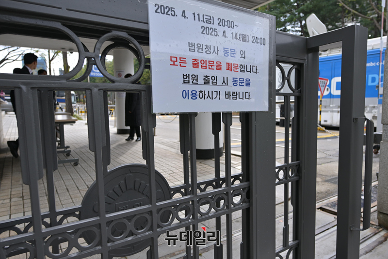윤석열 전 대통령의 내란 혐의 첫 형사 재판이 열린 14일 오전 서울 서초구 서울중앙지방법원에 차벽이 세워져 있다. 법원은 11일 밤부터 이날 자정까지 필수업무 차량을 제외한 차량의 출입을 금지하는 등 청사 보안을 강화했다. (사진=공동취재단)