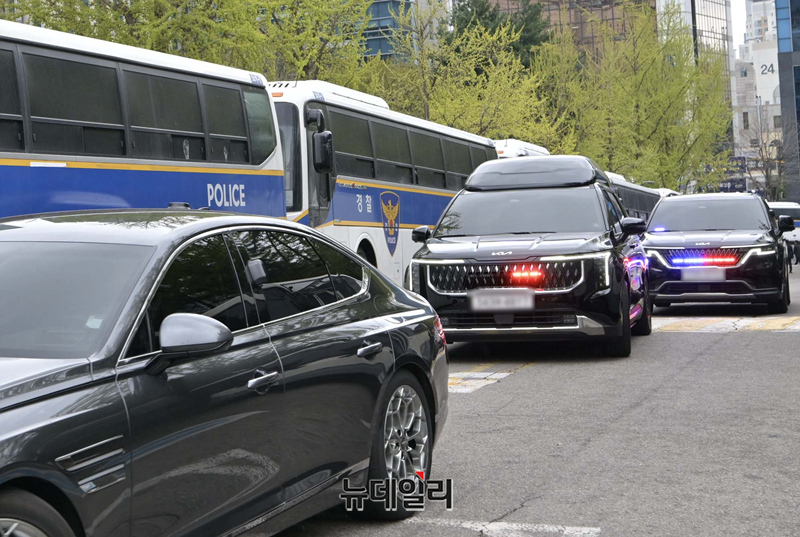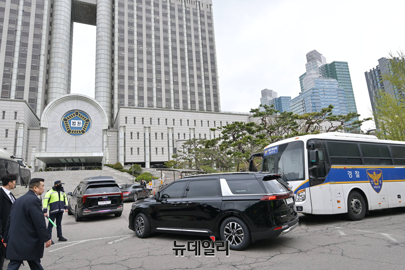 윤석열 전 대통령의 내란 혐의 첫 형사 재판이 열리는 14일 오전 서울 서초구 서울중앙지방법원으로 윤 전 대통령이 탑승한 차량이 들어가고 있다. (사진=공동취재단)