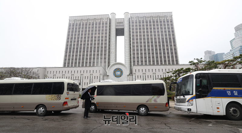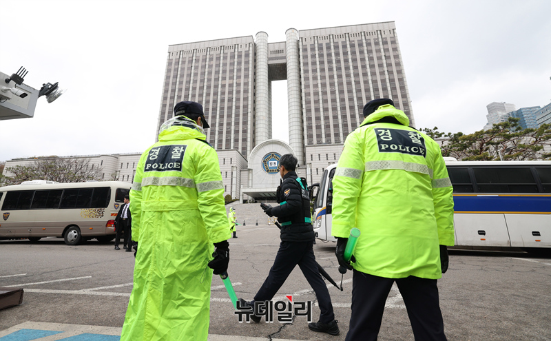 내란 우두머리 혐의로 기소된 윤석열 전 대통령의 첫 정식 형사재판이 열리는 14일 오전 윤 전 대통령이 탑승한 차량이 서울 서초구 서울중앙지방법원 지하주차장으로 들어간 뒤 입구가 통제되고 있다. (사진=공동취재단)