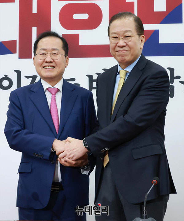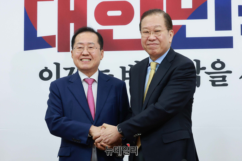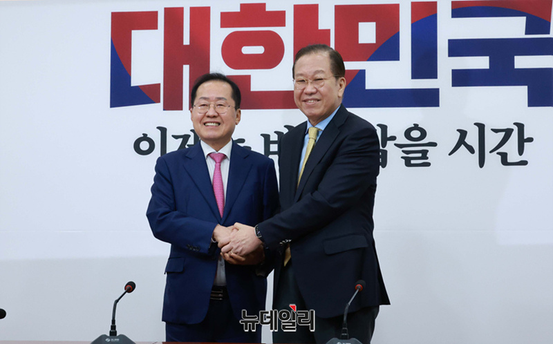권영세 국민의힘 비상대책위원장과 홍준표 전 대구시장이 14일 오전 국회에서 면담을 갖기에 앞서 기념촬영을 하고 있다.