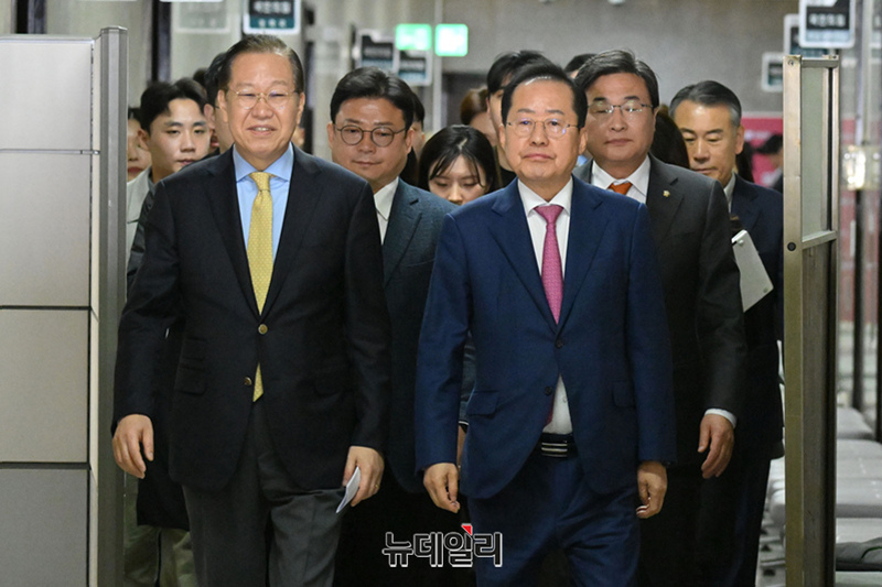 권영세 국민의힘 비상대책위원장과 홍준표 전 대구시장이 14일 오전 국회에서 면담을 갖기 위해 입장하고 있다.