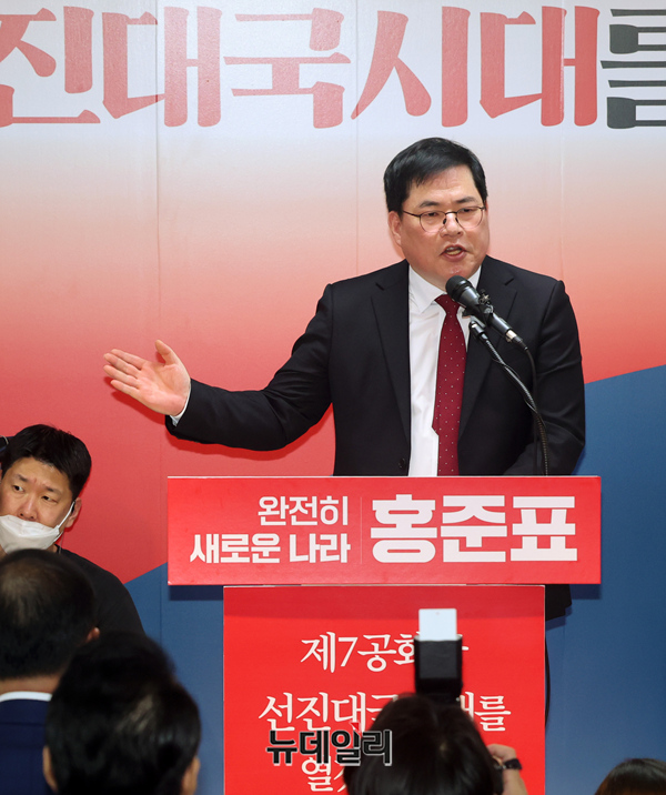 홍준표 전 대구시장이 14일 오후 서울 여의도 대하빌딩에 마련된 선거캠프에서 제21대 대통령 선거 출마 선언을 한 가운데 유동규 전 성남도시개발공사 기획본부장이 지지 발언을 하고 있다.