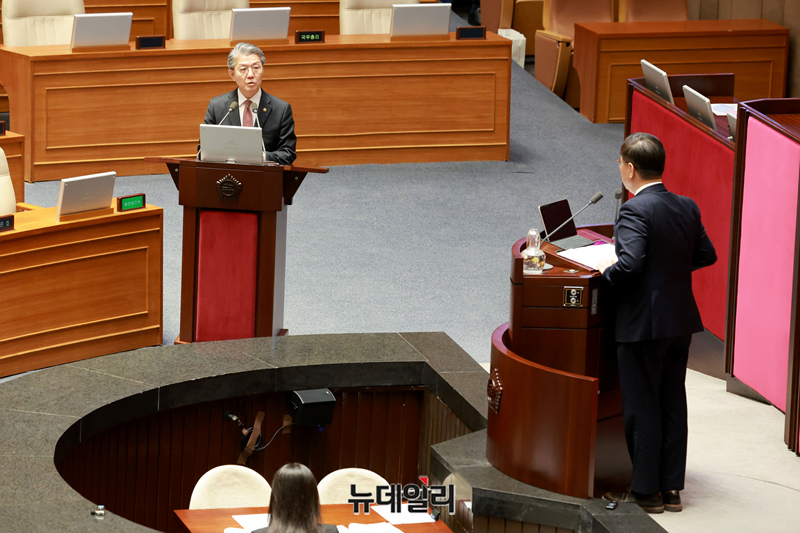 김홍균 외교부 1차관이 14일 오후 국회에서 열린 정치·외교·통일·안보 분야 대정부질문을 위한 본회의에 참석해 질의에 답변을 하고 있다.