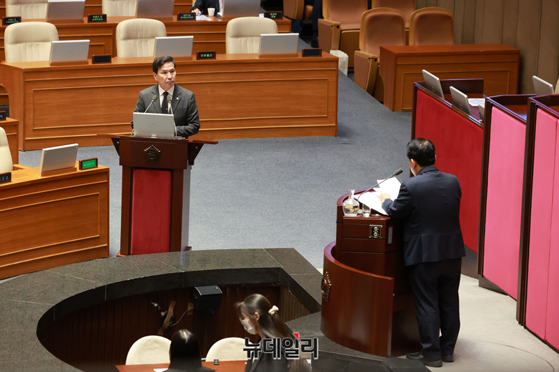 김선호 국방부 장관 직무대행이 14일 오후 국회에서 열린 정치·외교·통일·안보 분야 대정부질문을 위한 본회의에 참석해 질의에 답변을 하고 있다.