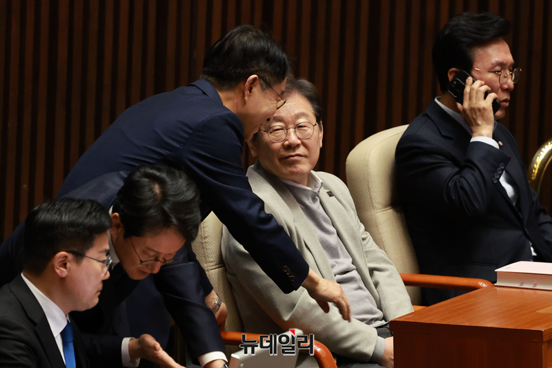 이재명 전 더불어민주당 대표가 14일 국회 본회의에서 열린 정치·외교·통일·안보 분야 대정부질문에서 의원들과 대화를 하고 있다.