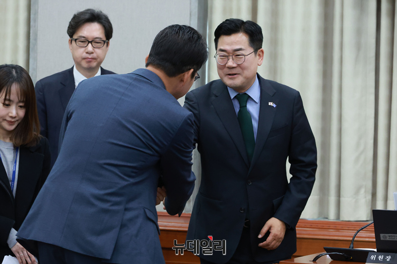 박찬대 운영위원장이 15일 오전 국회에서 열린 운영위원회 전체회의에 참석해 안건 통과 시킨 후 의원들과 인사를 나누고 있다.