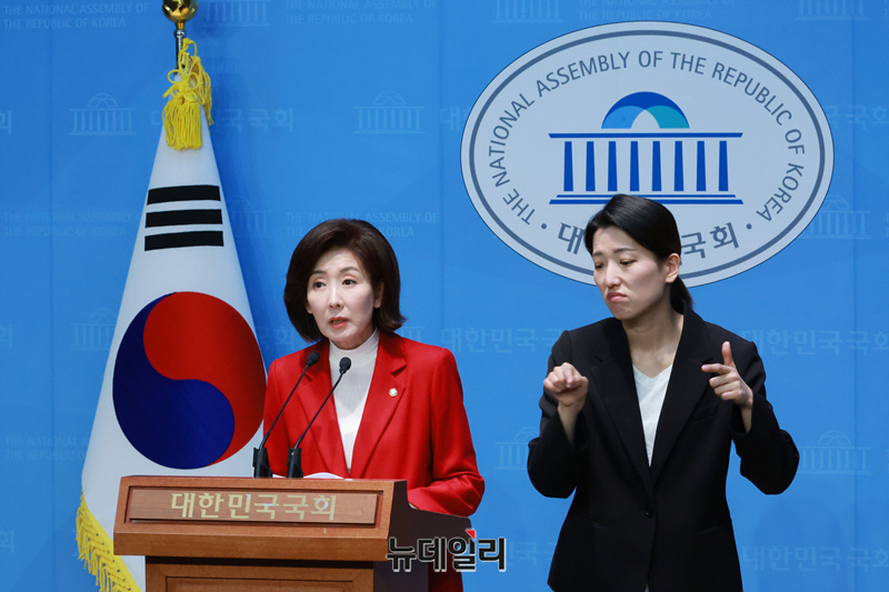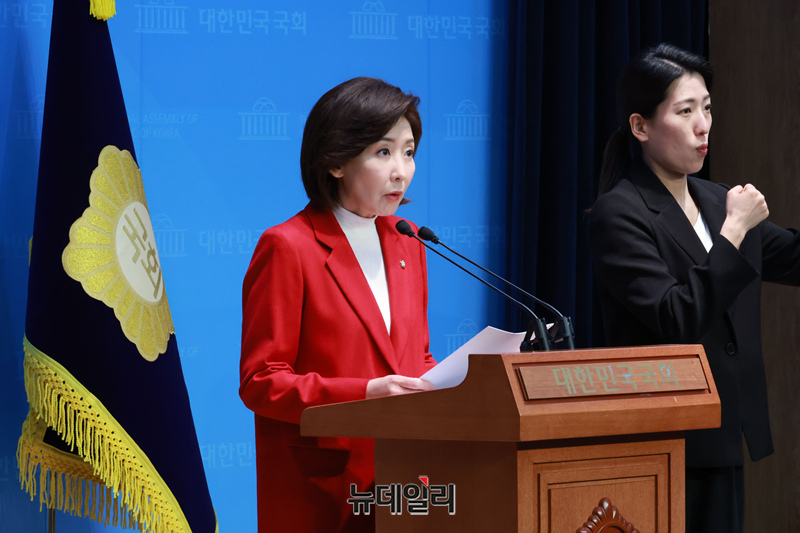 국민의힘 대선 경선에 출마한 나경원 의원이 15일 국회 소통관에서 'G5 강국 공약'을 발표하고 있다.
