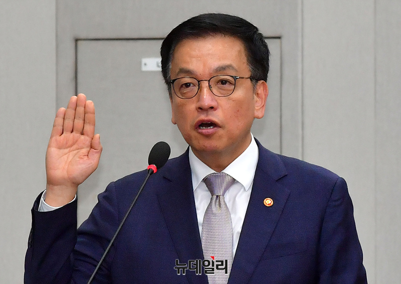 최상목 부총리 겸 기획재정부 장관이 16일 국회에서 열린 법제사법위원회의 '기획재정부 장관 최상목 탄핵소추사건 조사' 청문회에서 선서를 하고 있다.
