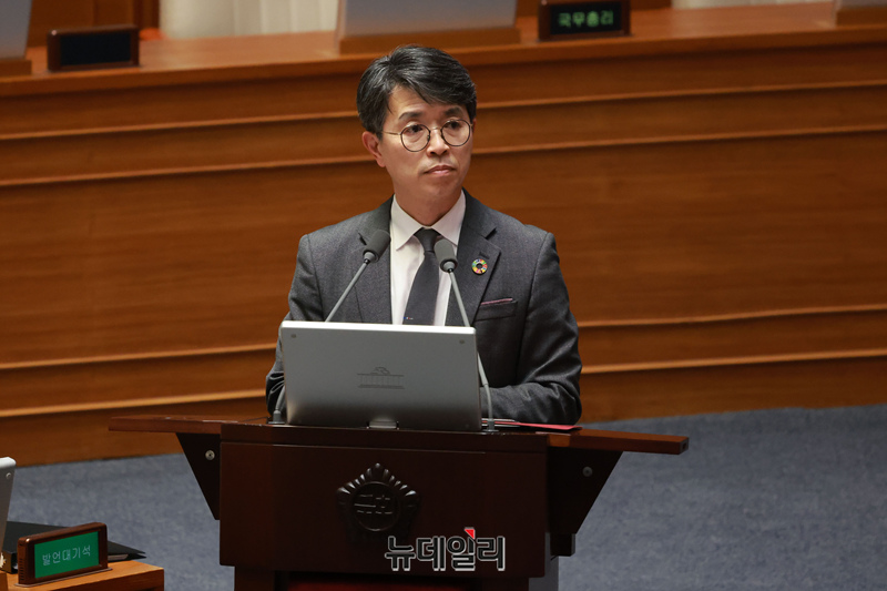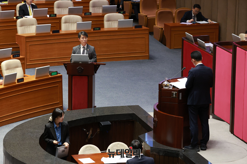 김완섭 환경부 장관이 16일 오후 국회에서 열린 본회의 교육·사회·문화에 관한 대정부질문에서 의원들의 질의에 답변하고 있다.