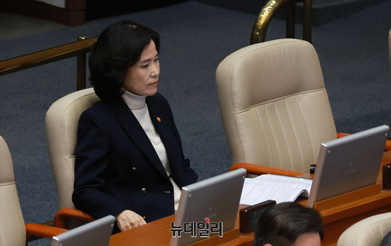 이진숙 방송통신위원장이 16일 오후 국회에서 열린 본회의 교육·사회·문화에 관한 대정부질문에 출석해 앉아 있다.