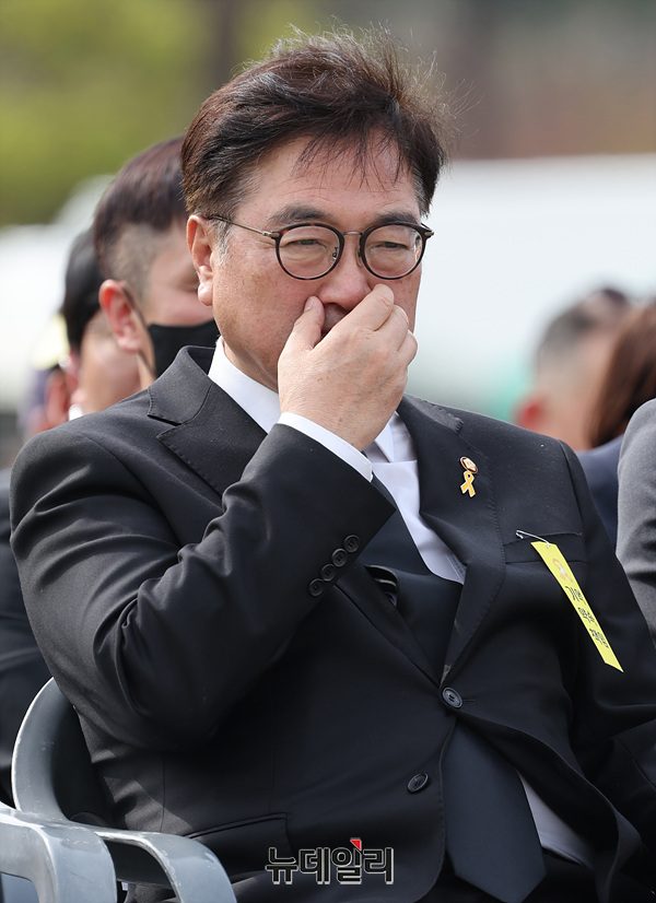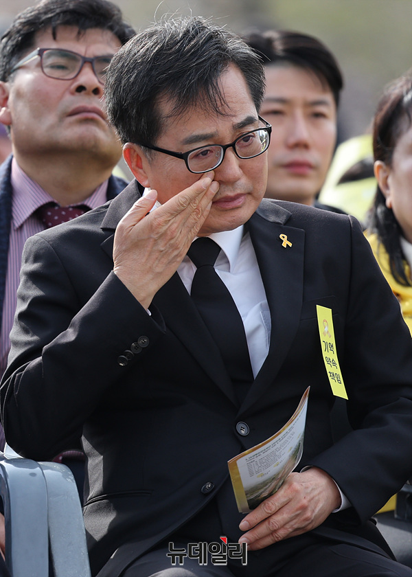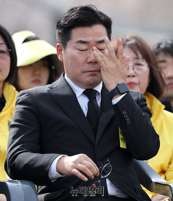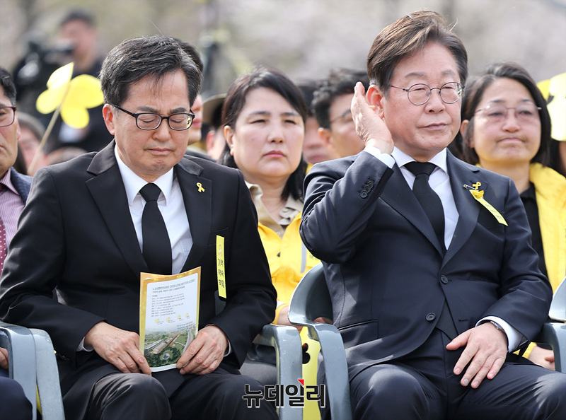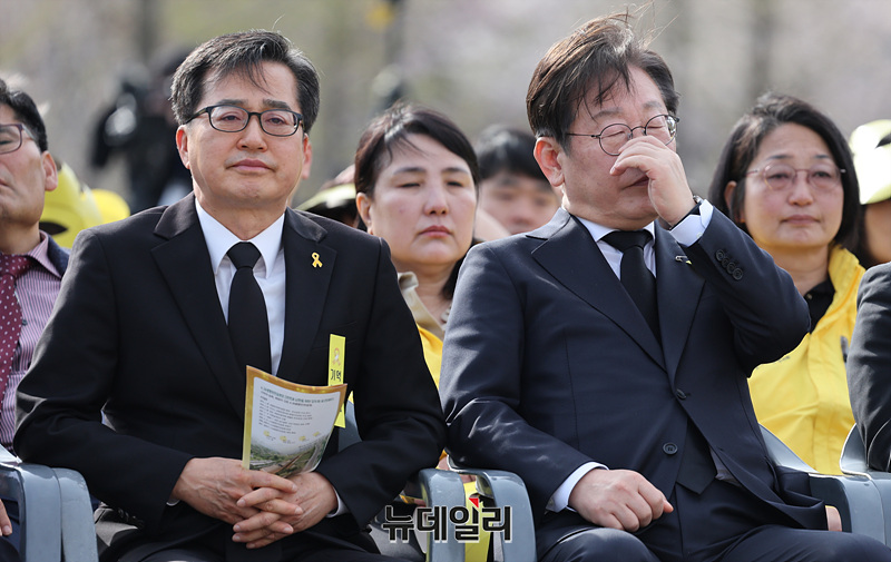 세월호 참사 11주기 기억식이 열린 16일 경기 안산시 단원구 화랑유원지에서 이재명 전 더불어민주당 대표를 비롯한 참석자들이 기억영상 시청 중 눈물을 흘리고 있다. (경기 안산=서성진 기자)