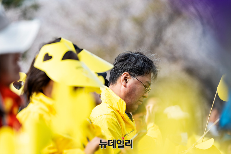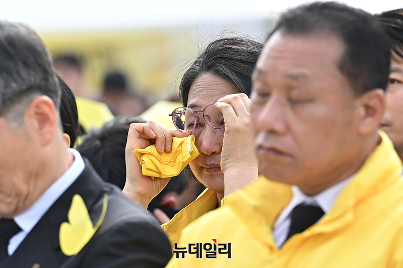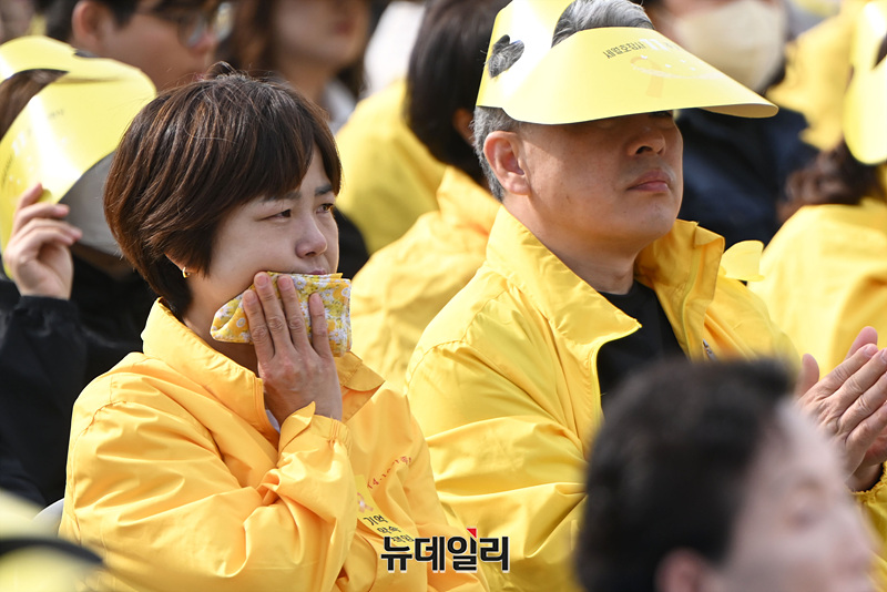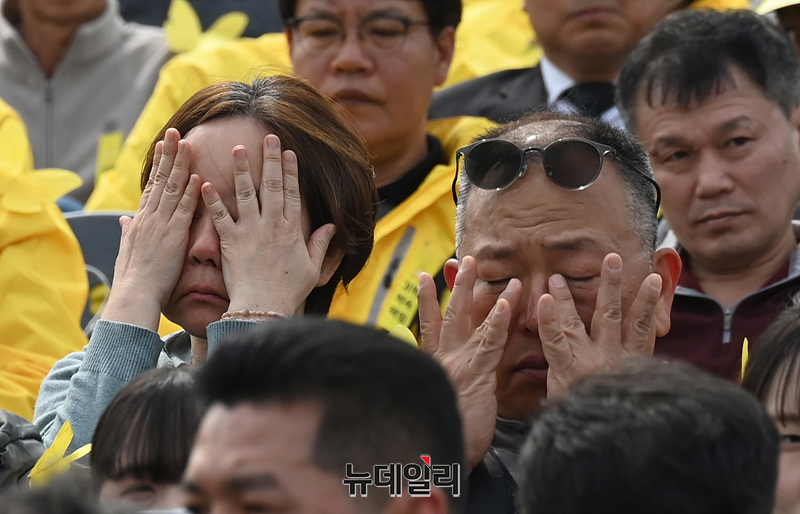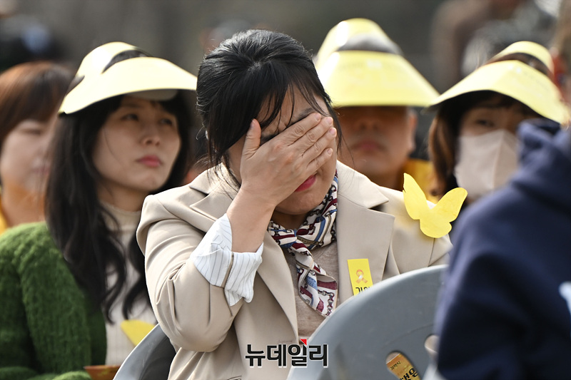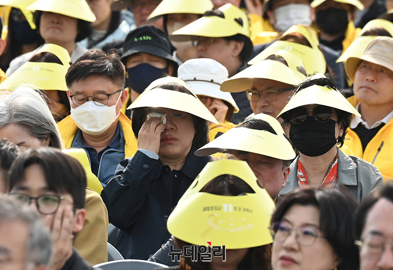 세월호 참사 11주기 기억식이 열린 16일 경기 안산시 단원구 화랑유원지에서 유가족들이 기억영상 시청 중 눈물을 흘리고 있다. (경기 안산=서성진 기자)