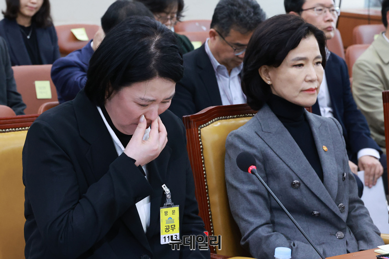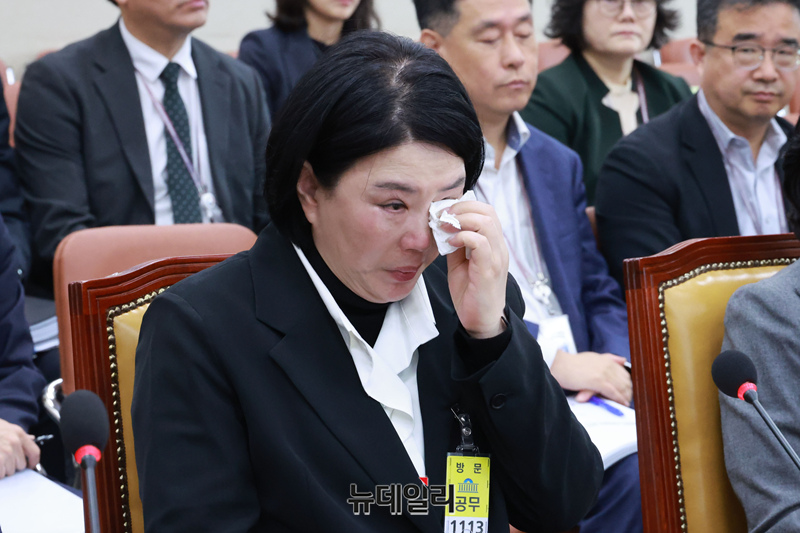 고 오요안나 씨의 어머니인 장연미 씨가 18일 국회에서 열린 '고 오요안나 기상캐스터 사망 사건 관련 긴급 현안질의'에서 눈물을 흘리고 있다.