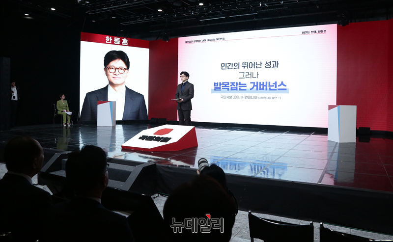한동훈 국민의힘 경선 후보가 18일 오후 서울 강서구 ASSA아트홀에서 열린 국민의힘 '제21대 대통령후보자 1차 경선 비전대회'에서 비전을 발표하고 있다.