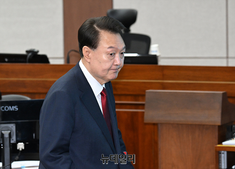 윤석열 전 대통령이 21일 서울 서초동 서울중앙지법에서 열린 내란 우두머리 혐의 형사재판 2번째 공판에 출석하고 있다. (사진=공동취재단)