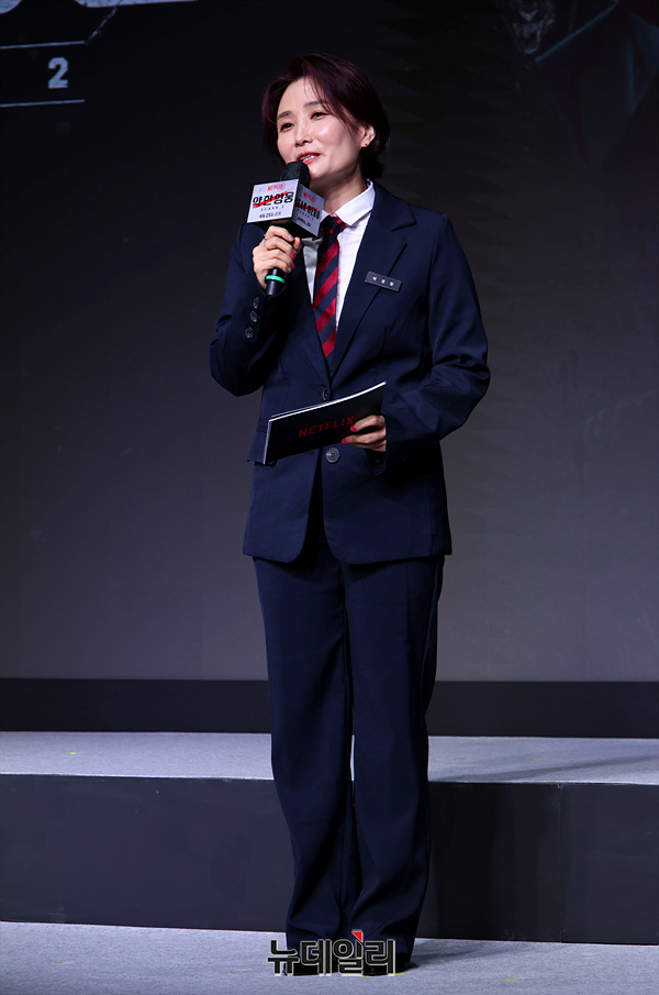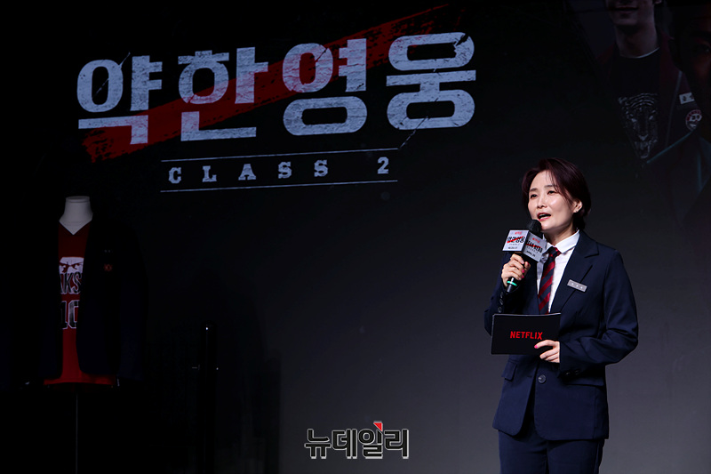 MC 박경림이 21일 오전 서울 마포구 호텔 나루 엠갤러리에서 넷플릭스 드라마 '약한영웅 Class 2'를 소개하고 있다.