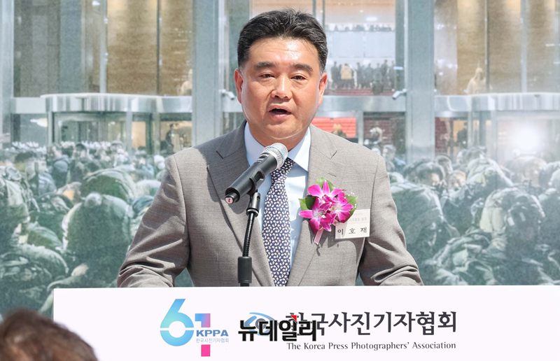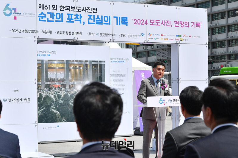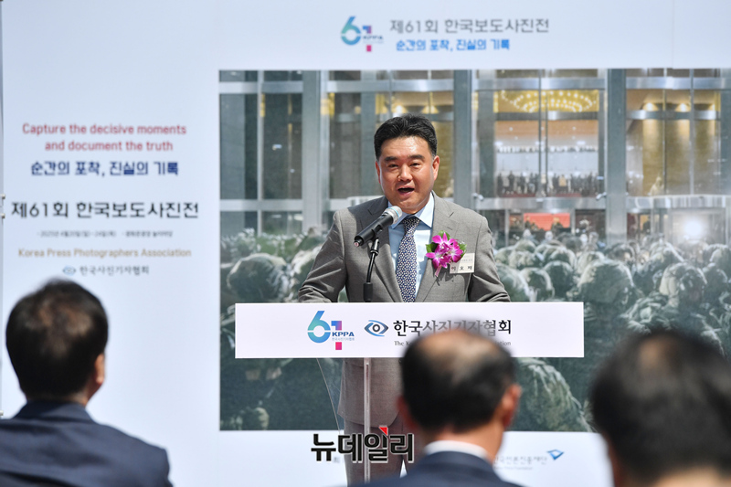 이호재 한국사진기자협회장이 21일 서울 종로구 광화문 광장에서 열린 제61회 한국보도사진전 '순간의 포착, 진실의 기록' 개막식에서 인사말을 하고 있다. (사진=공동취재단)