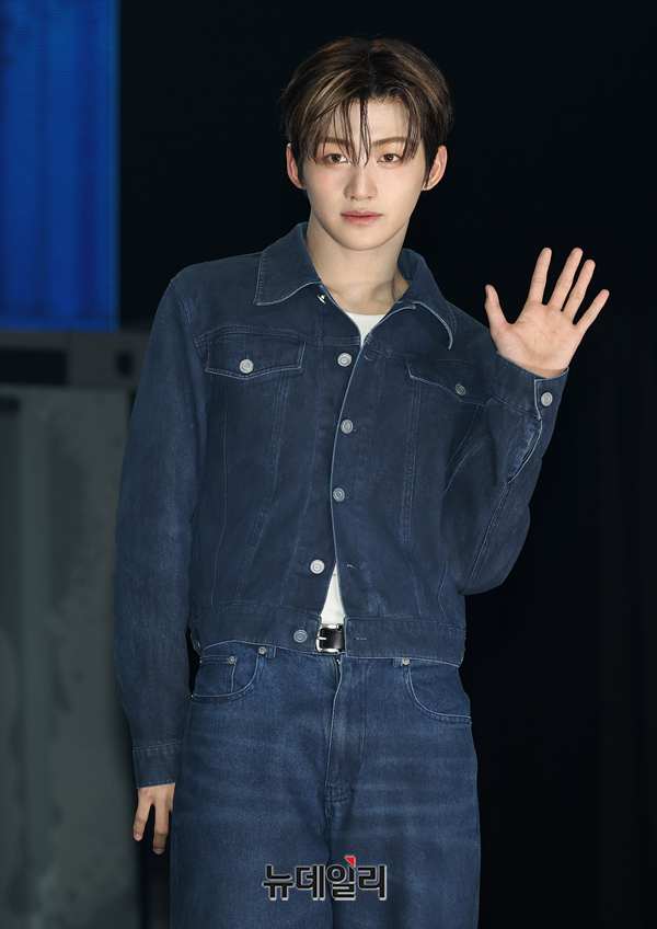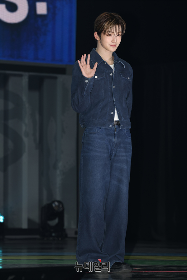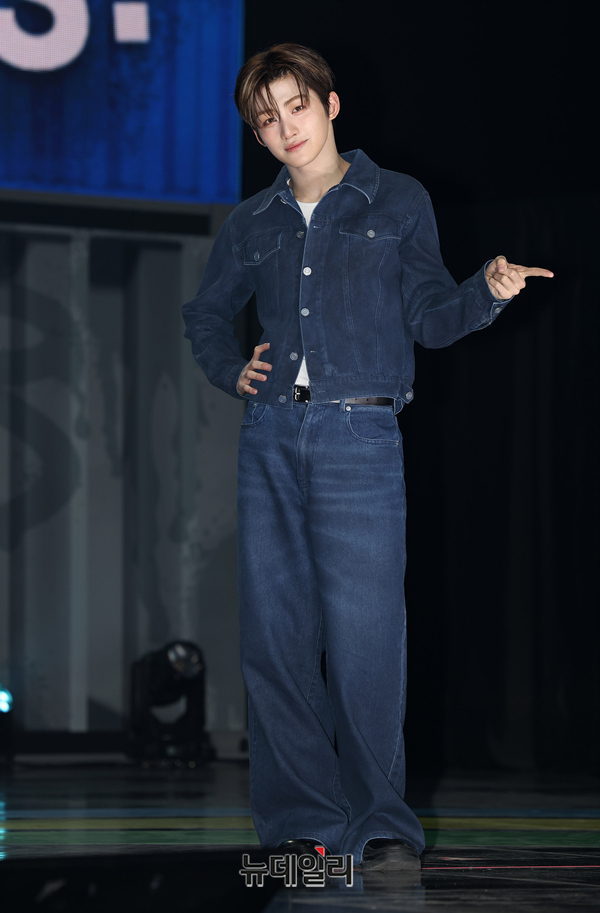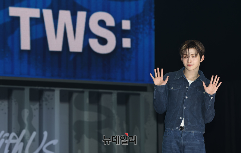 TWS(투어스) 지훈이 21일 오후 서울 용산구 블루스퀘어에서 열린 미니 3집 'TRY WITH US' 미디어 쇼케이스에서 포즈를 취하고 있다.