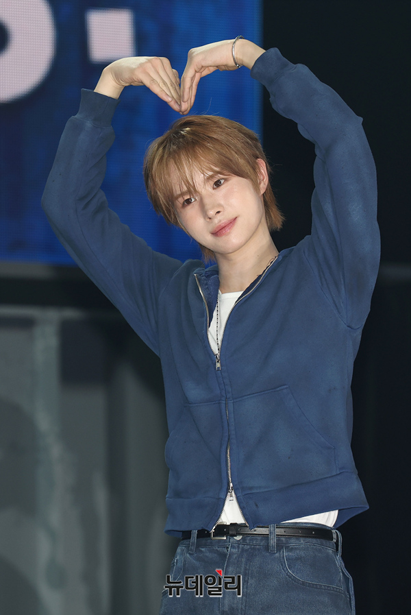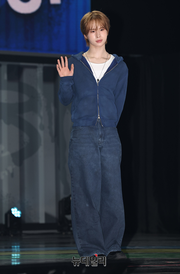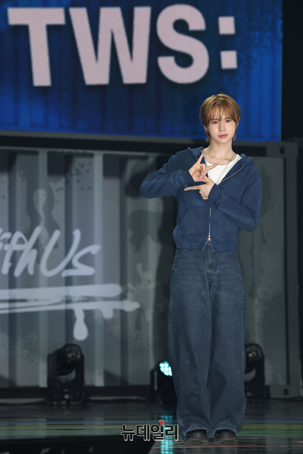 TWS(투어스) 경민이 21일 오후 서울 용산구 블루스퀘어에서 열린 미니 3집 'TRY WITH US' 미디어 쇼케이스에서 포즈를 취하고 있다.