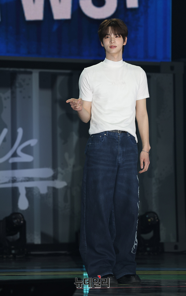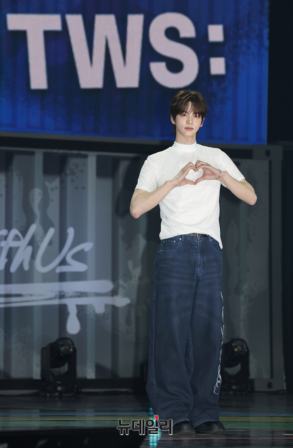 TWS(투어스) 신유가 21일 오후 서울 용산구 블루스퀘어에서 열린 미니 3집 'TRY WITH US' 미디어 쇼케이스에서 포즈를 취하고 있다.