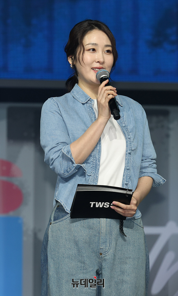 신아영 아나운서가 21일 오후 서울 용산구 블루스퀘어에서 열린 투어스 미니 3집 'TRY WITH US' 미디어 쇼케이스에서 인사말을 하고 있다.