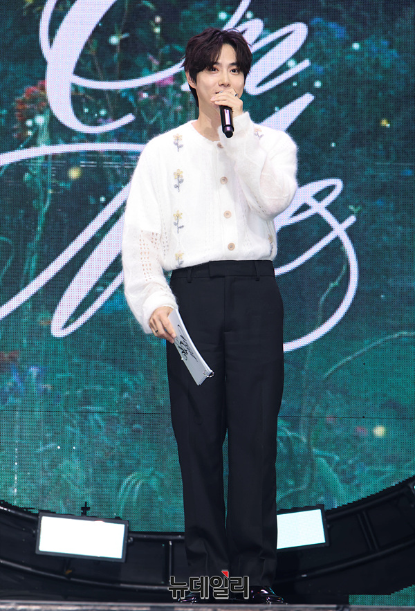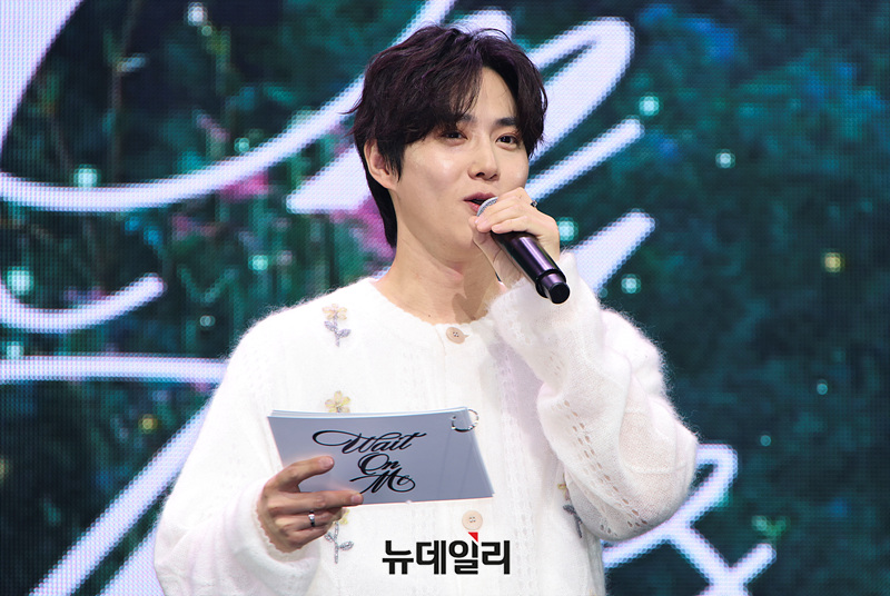 엑소 수호가 21일 오후 서울 광진구 예스24 라이브홀에서 열린 네 번째 미니앨범 '웨이트 온 미(Wait on me)' 발매 기념 쇼케이스에서 카이를 소개하고 있다.