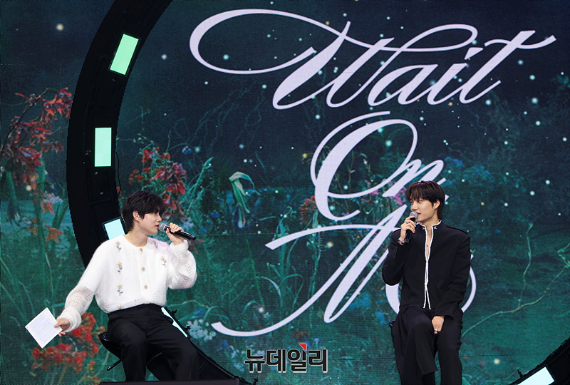엑소 수호와 카이가 21일 오후 서울 광진구 예스24 라이브홀에서 열린 네 번째 미니앨범 '웨이트 온 미(Wait on me)' 발매 기념 쇼케이스에서 앨범토크를 나누고 있다.
