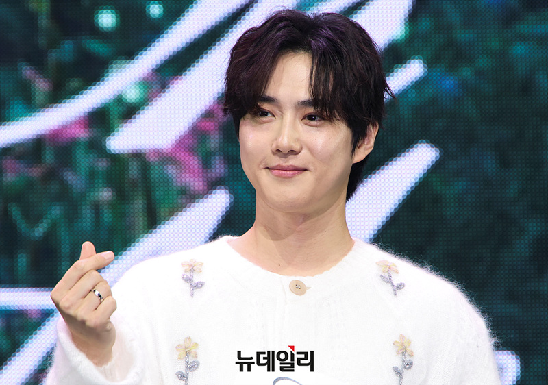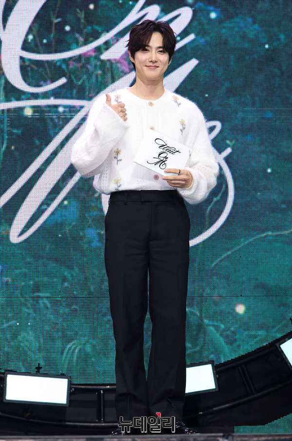 엑소 수호가 21일 오후 서울 광진구 예스24 라이브홀에서 열린 네 번째 미니앨범 '웨이트 온 미(Wait on me)' 발매 기념 쇼케이스에서 포즈를 취하고 있다.