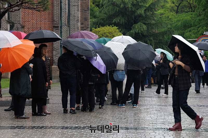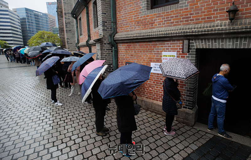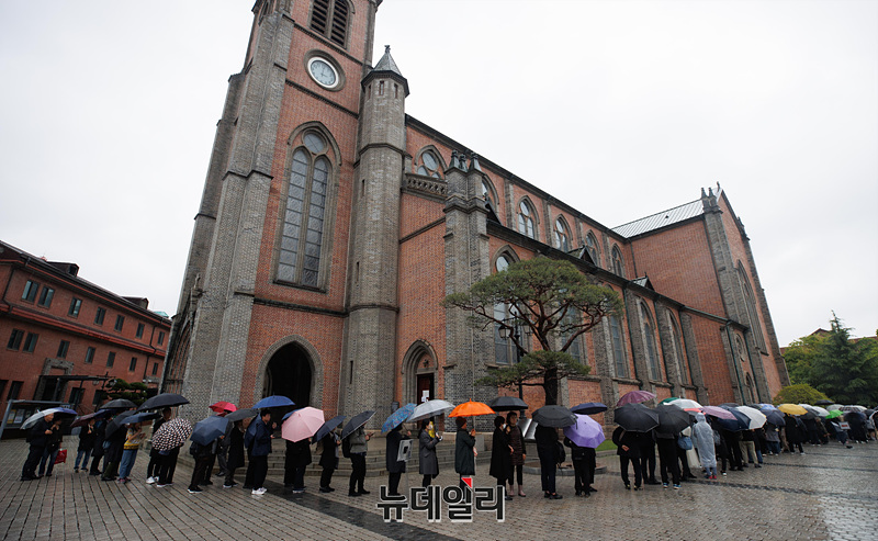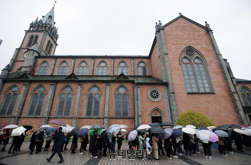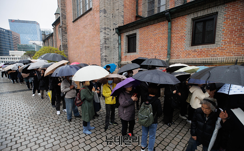지난 21일(현지시간) 선종한 프란치스코 교황의 빈소가 서울 중구 명동대성당에 마련된 가운데 22일 오후 조문객들이 추모를 위해 줄을 서고 있다. (사진=공동취재단)
