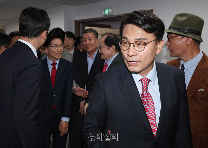 윤상현 국민의힘 의원이 23일 오후 서울 여의도 김문수 선거 캠프에서 김 경선 후보를 지지하기 위해 함께 입장하고 있다.