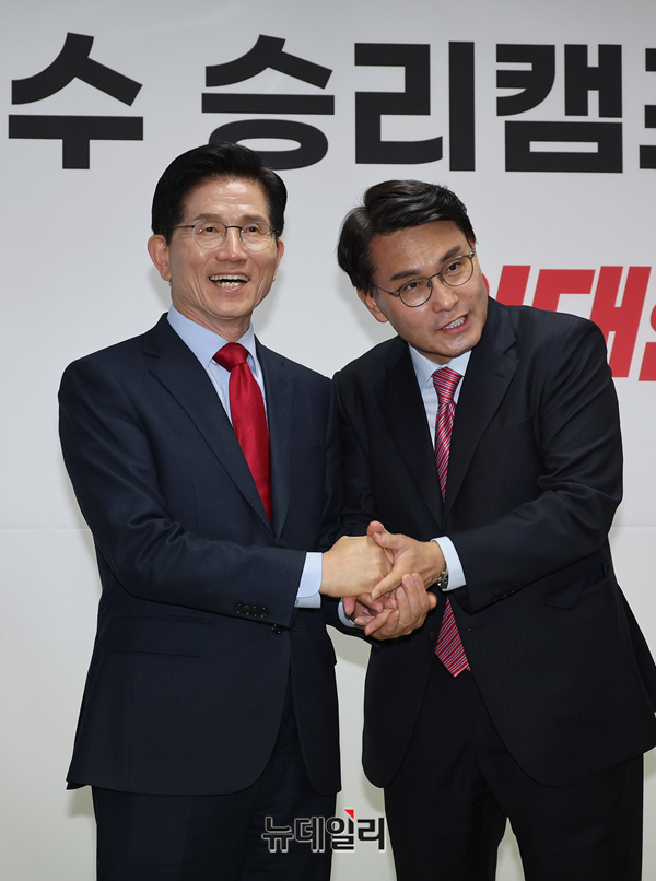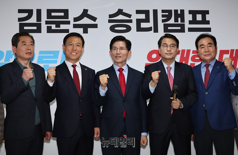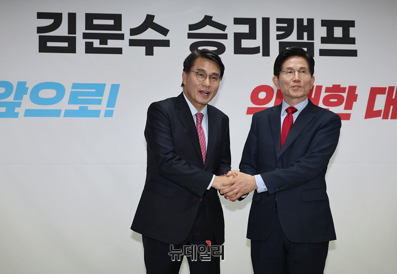 김문수 국민의힘 대선 경선 후보와 지지 선언을 위해 캠프를 방문한 윤상현 의원이 23일 오후 서울 여의도 김문수 선거 캠프에서 손을 잡고 기념촬영을 하고 있다.