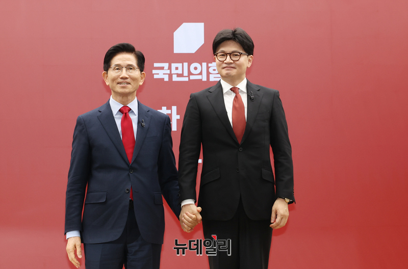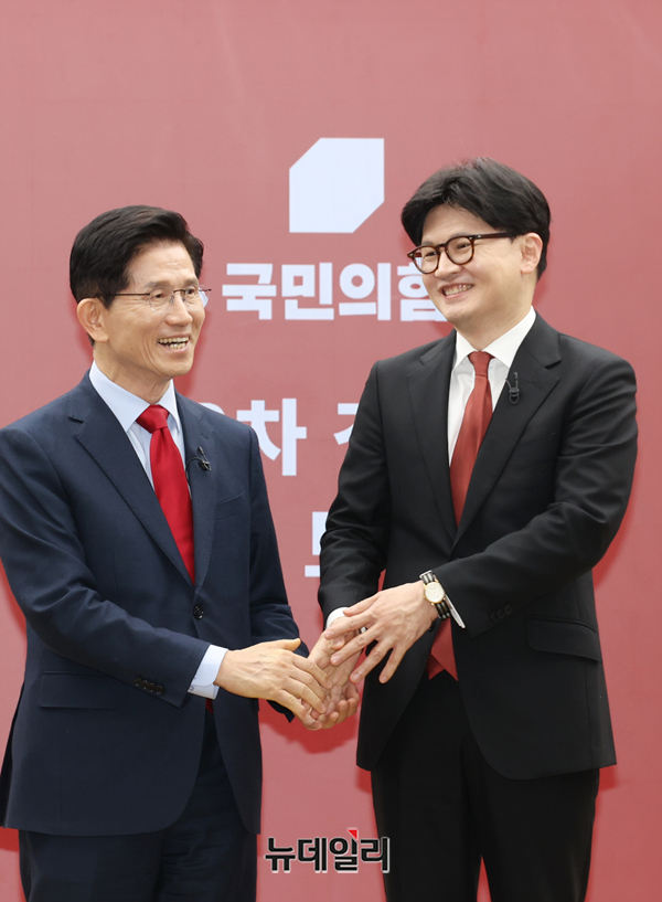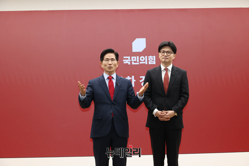 국민의힘 김문수(왼쪽), 한동훈 대선 경선 후보가 23일 오후 서울 여의도 당사에서 열린 2차 경선 진출 후보 미디어데이에서 기념촬영을 하고 있다.