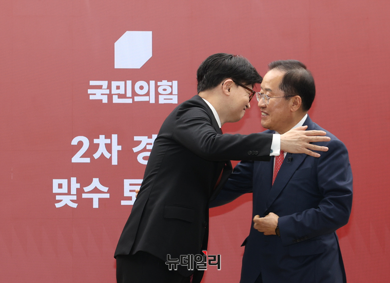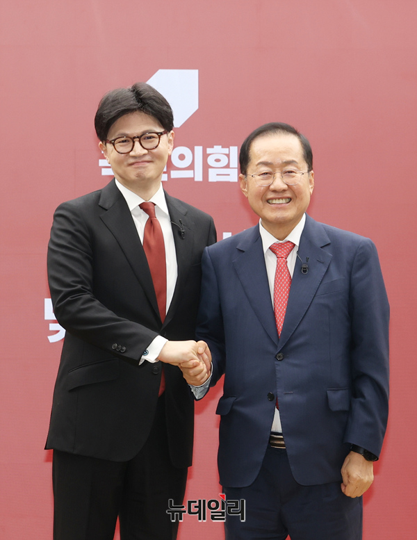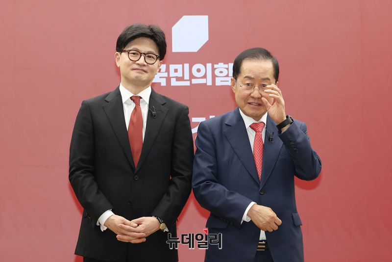 국민의힘 한동훈, 홍준표 대선 경선 후보가 23일 오후 서울 여의도 당사에서 열린 2차 경선 진출 후보 미디어데이에서 기념촬영을 하고 있다.