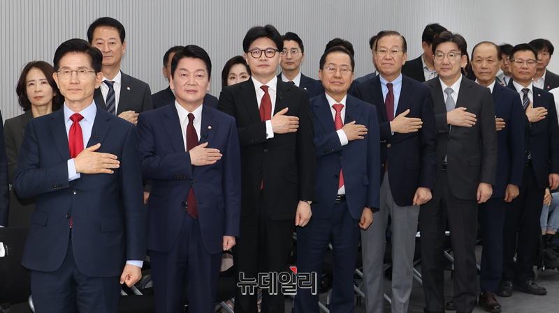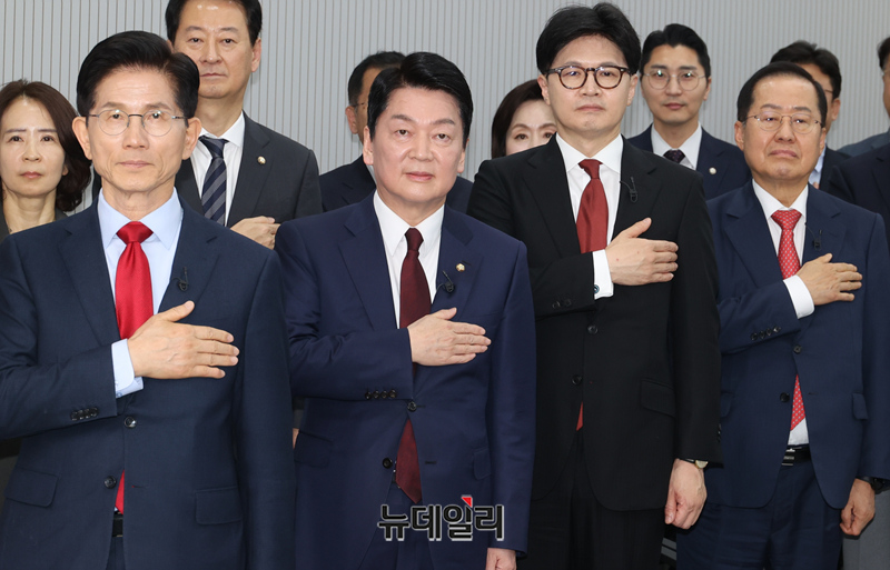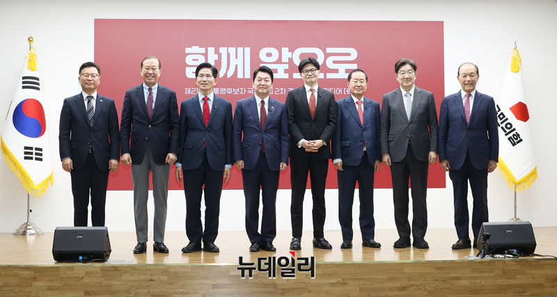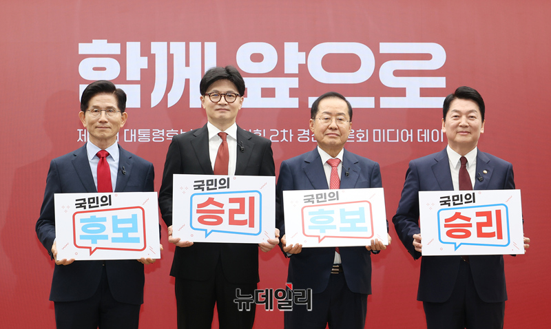국민의힘 김문수, 안철수, 한동훈, 홍준표 대선 경선 후보와 지도부가 23일 오후 서울 여의도 당사에서 열린 2차 경선 진출 후보 미디어데이에서 기념촬영을 하고 있다.
