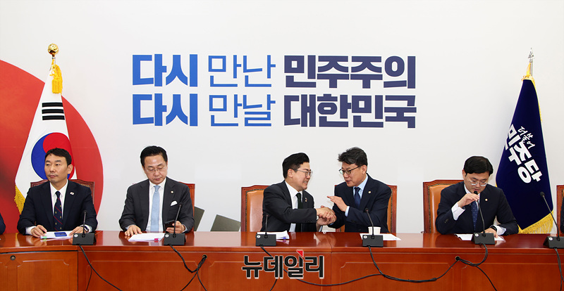 박찬대 더불어민주당 당대표 직무대행 겸 원내대표와 진성준 정책위의장이 24일 국회에서 열린 정책조정회의에서 인사를 나누고 있다.