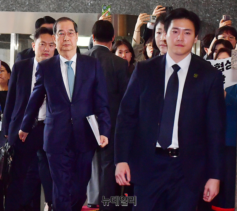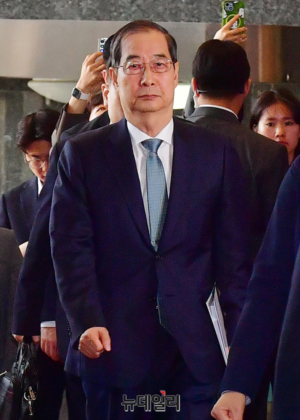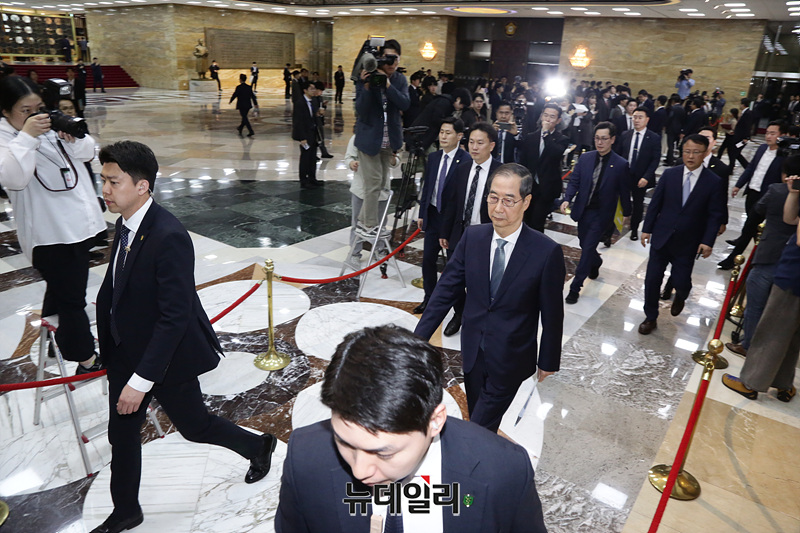 한덕수 대통령 권한대행 국무총리가 24일 오전 국회에서 열린 본회의에서 2025년도 제1회 추가경정예산안에 대한 정부 시정연설을 위해 이동하고 있다.