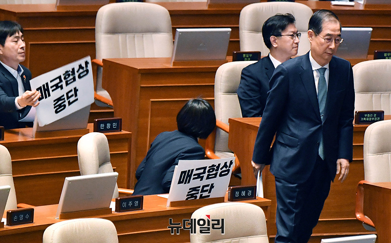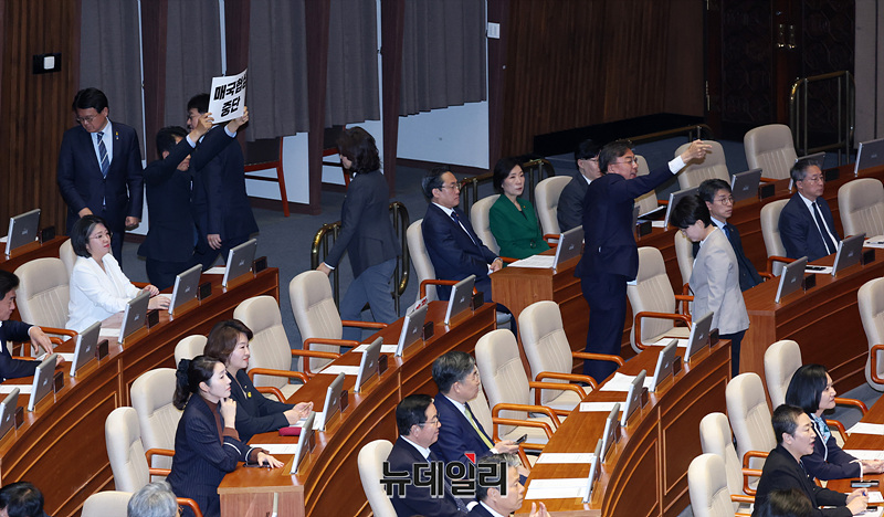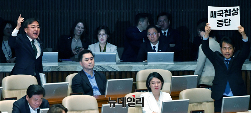 윤종오 진보당 의원이 24일 국회 본회의에서 한덕수 대통령 권한대행 국무총리의 추가경정예산안 시정연설이 시작되자 '매국협상 중단' 피켓을 들어보이고 있다.