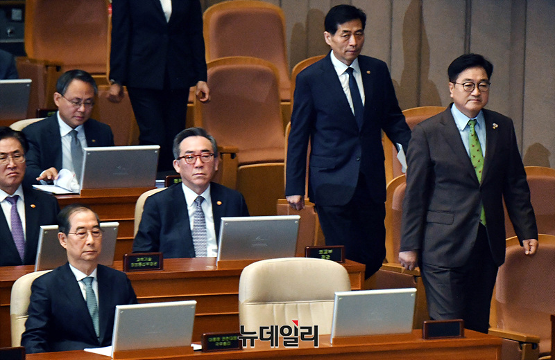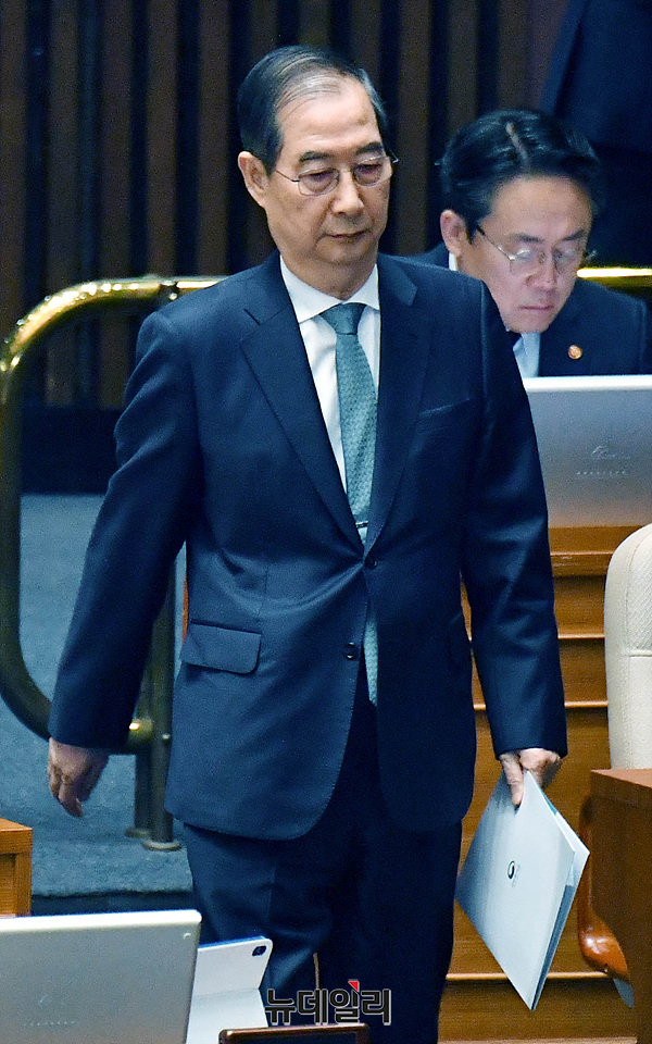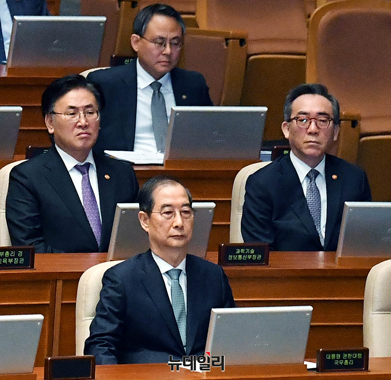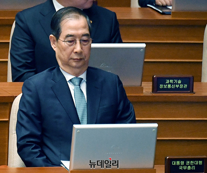 한덕수 대통령 권한대행 국무총리가 24일 오전 국회에서 열린 본회의에 참석해 자리하고 있다.