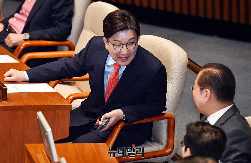 권성동 국민의힘 원내대표가 24일 오전 국회에서 열린 본회의에서 의원들과 대화를 나누고 있다.