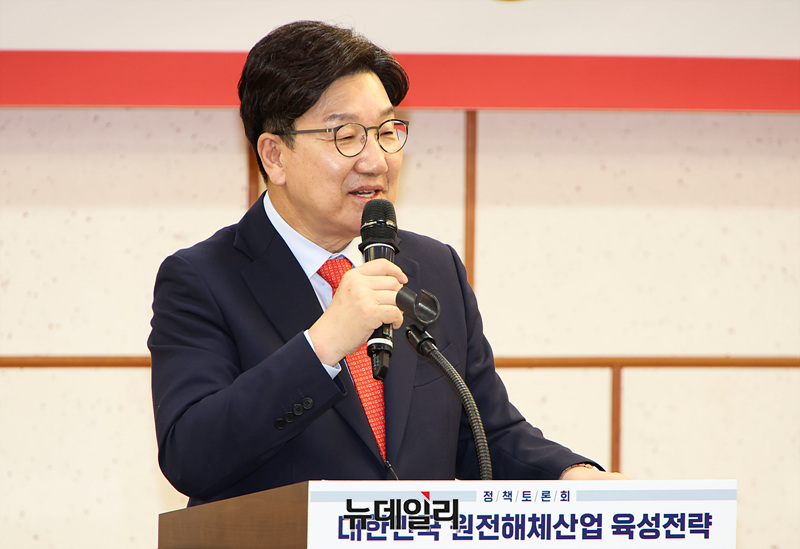 권성동 국민의힘 원내대표가 24일 오후 국회 의원회관에서 열린 대한민국 원전해체산업 육성전략 정책토론회에서 축사를 하고 있다.