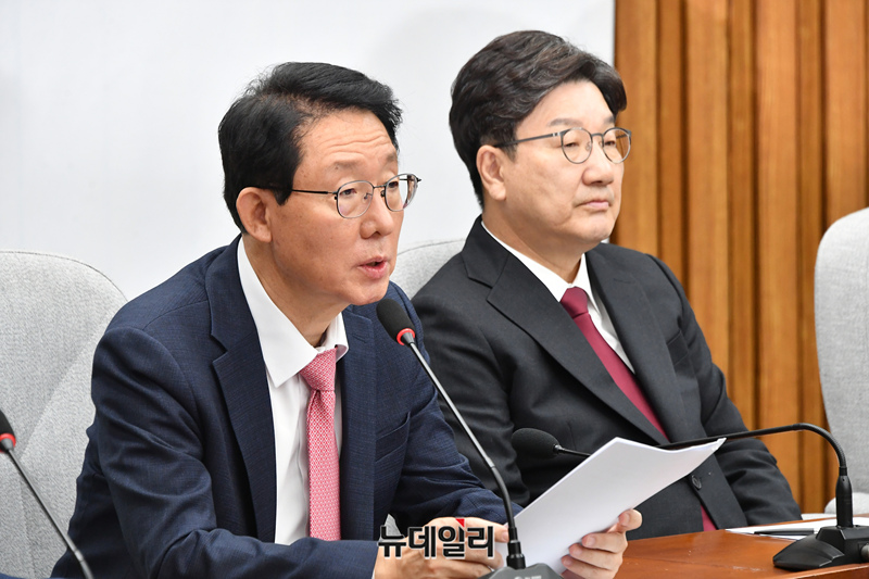 김상훈 국민의힘 정책위의장이 25일 오전 국회에서 열린 원내대책회의에서 모두발언을 하고 있다.