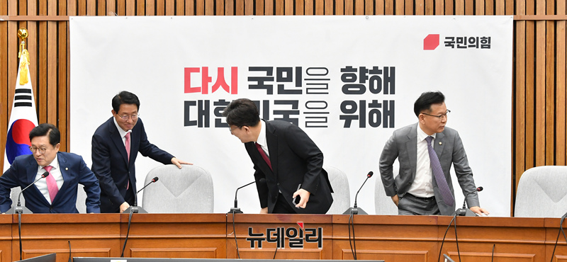 권성동 국민의힘 원내대표와 김상훈 정책위의장이 25일 오전 국회에서 열린 원내대책회의에 참석하고 있다.