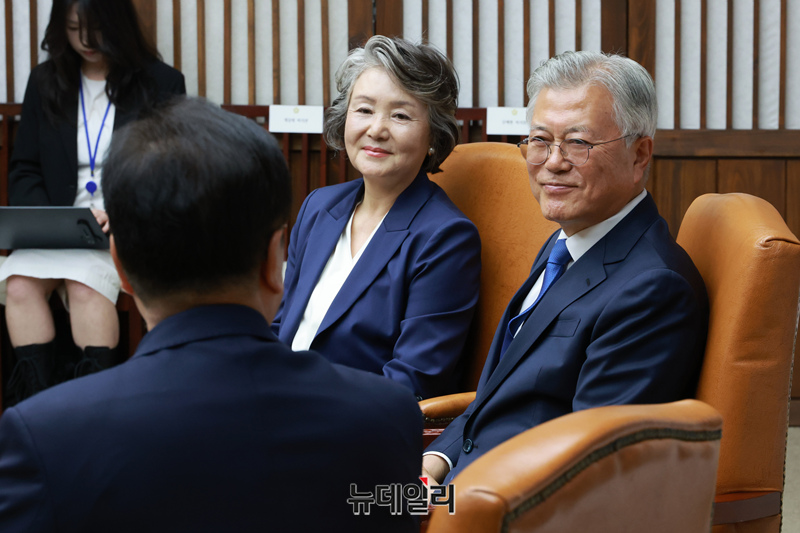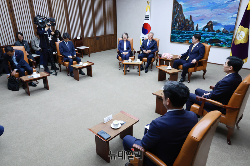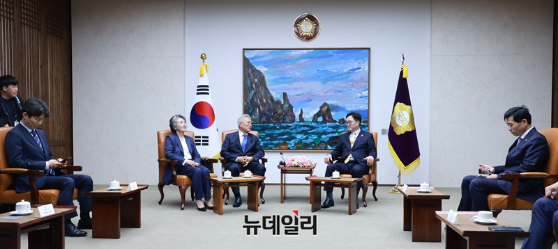 4·27 판문점선언 7주년 기념식 참석을 위해 국회를 방문한 문재인 전 대통령이 25일 오후 국회에서 우원식 국회의장과 환담을 나누고 있다.
