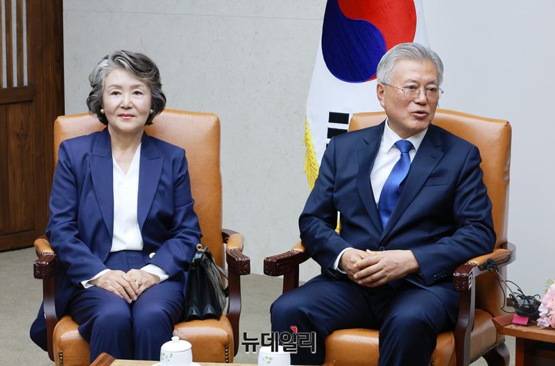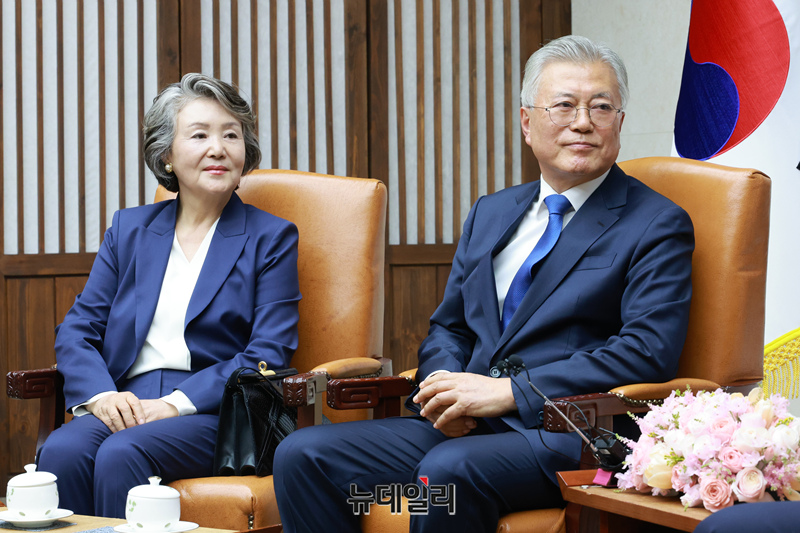 4·27 판문점선언 7주년 기념식 참석을 위해 국회를 방문한 문재인 전 대통령이 25일 오후 국회에서 우원식 국회의장과 환담을 나누고 있다.