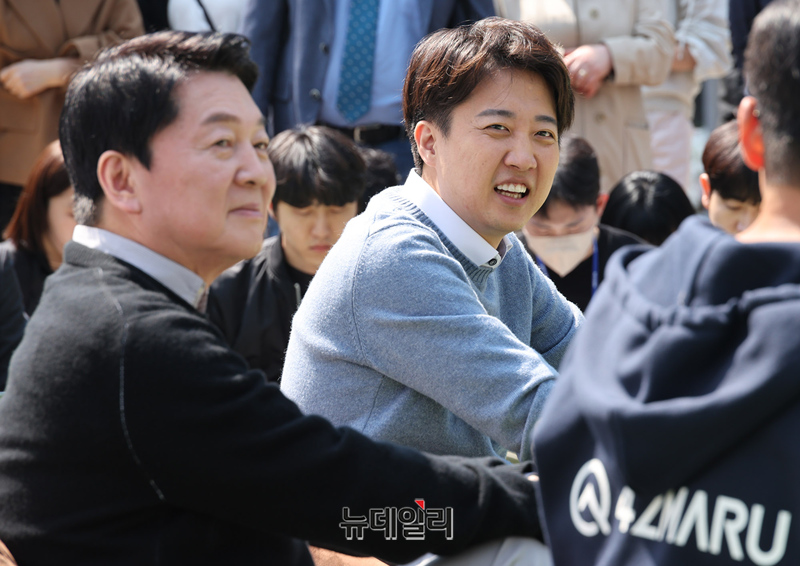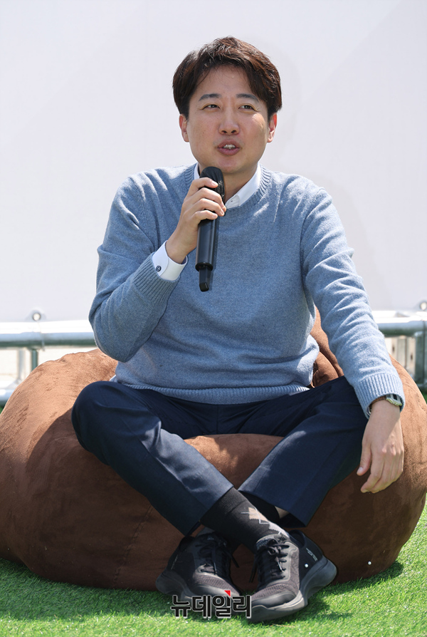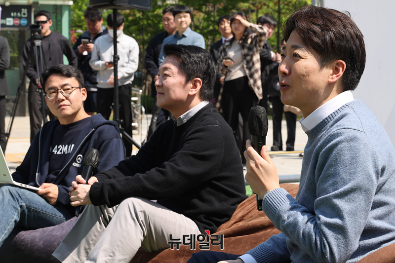 이준석 개혁신당 대선 후보가 25일 오후 경기 성남시 판교역에서 열린 안철수 국민의힘 경선 후보와 함께한 AI 기술패권시대 토크쇼에서 질문에 답하고 있다. (경기 성남=정상윤 기자)