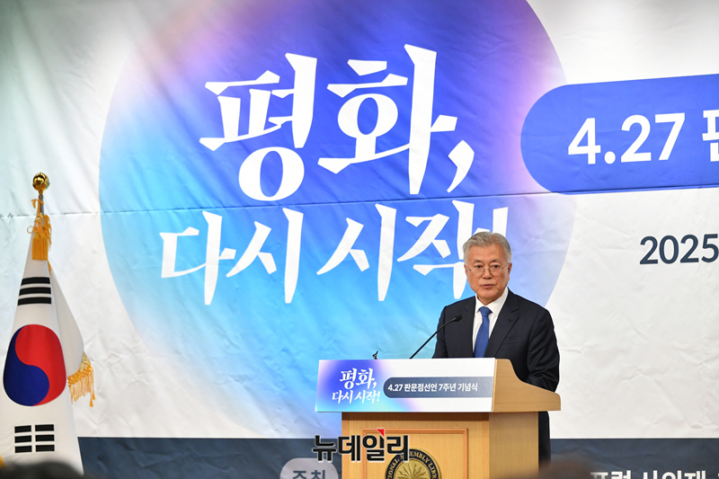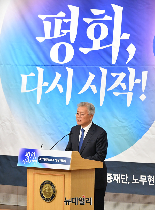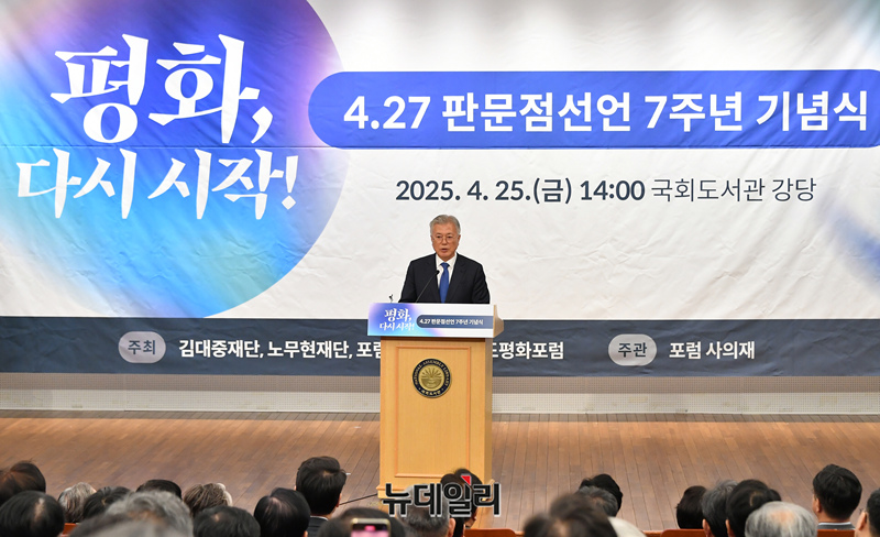 문재인 전 대통령이 25일 오후 국회 도서관 대강당에서 열린 '평화, 다시 시작!' 4.27 판문점선언 7주년 기념식에서 기념사를 하고 있다.